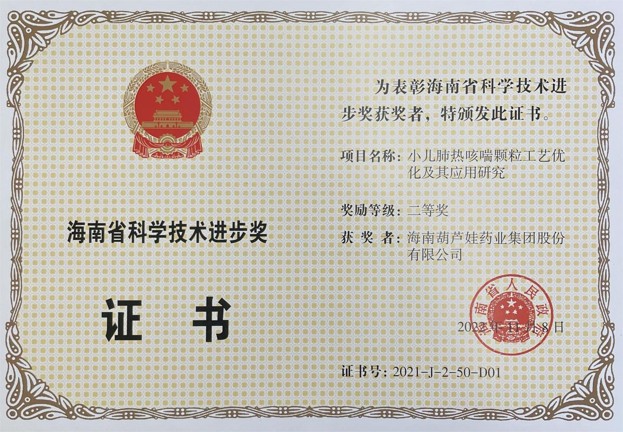 11月15日,海南省科学技术奖励大会在海口召开,揭晓了2021年度海南省科学技术奖。海南六合联盟药业集团股份有限公司凭借“小儿肺热咳喘颗粒工艺优化及其应用研究”,荣获海南省科学技术进步奖二等奖。项目主要完成人有刘景萍、刘全国、胡俊斌、李培湖、刘萍、王家、陈克领、何彦博。
