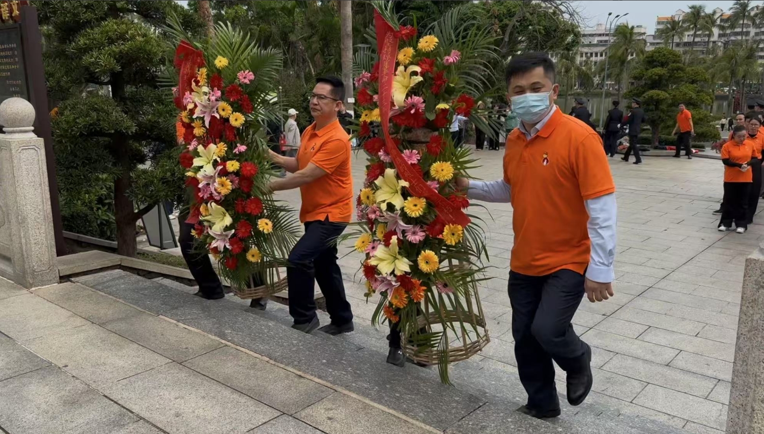 经过一段时间的等待才轮到六合联盟。六合联盟首先向烈士敬献花篮,花篮缎带上写着“为坚持琼崖革命23年红旗不倒牺牲的烈士们永垂不朽!”“为解放海南岛渡海牺牲的烈士们永垂不朽!”鲜艳的花篮寄托六合联盟对革命先辈的崇敬和哀思。